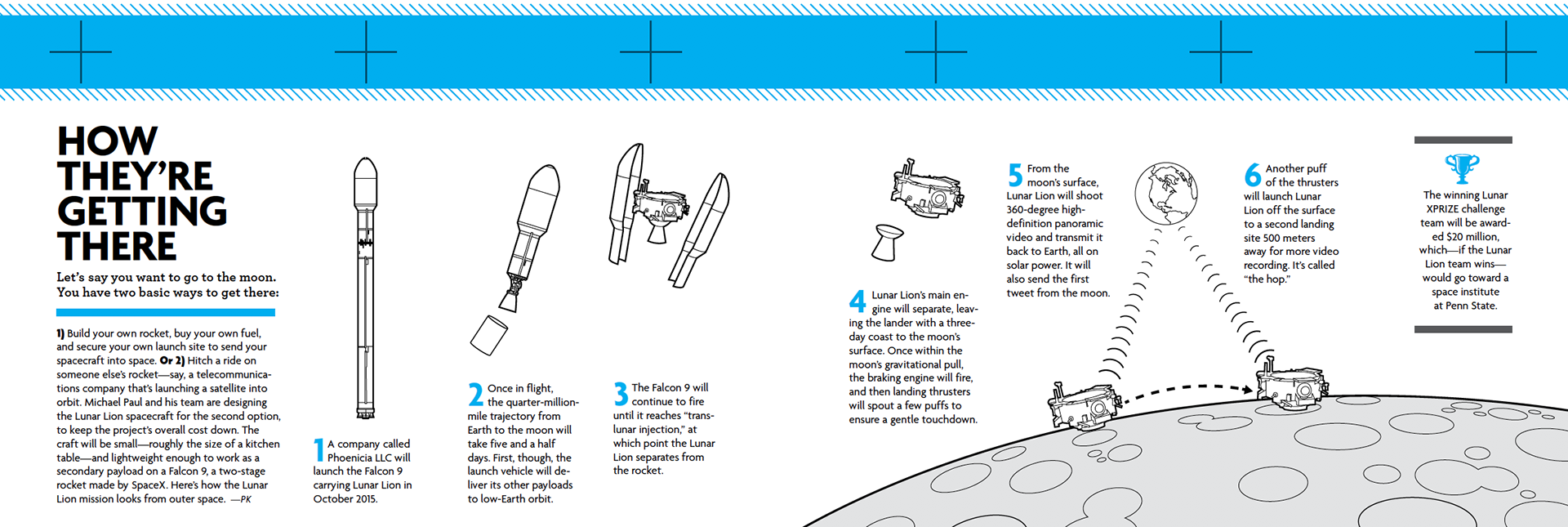 IN 2015, IF everything goes according to Paul’s plan, the Lunar Lion vehicle will be on its way out of Earth’s atmosphere. The team is currently testing various versions of descent and landing engines; a prototype of the craft will be constructed for field testing in the spring at the Mojave Air and Space Port in Mojave, Calif. Come launch day, Paul has big ideas for a glass-walled Lunar Lion operations center in a very public place on campus. He doesn’t want the excitement of launch or touchdown to fall flat, like his Messenger experience; he hopes the crowd will be so big that the mission will need to be video simulcast to multiple locations.